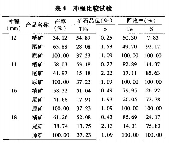 高梯度磁選機的特性之一,就是輔以脈動運動進行分選,故脈動沖程的合適選擇,對分選效果影響較大。沖程試驗中固定沖次為270r/min,轉環轉速為3.6r/min,變更不同的沖程,試驗結果見表4。