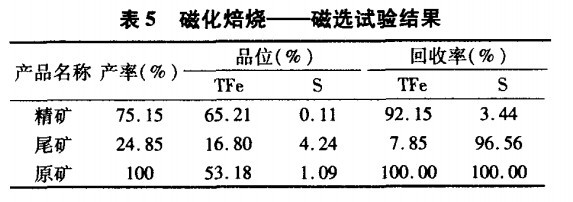 由于采用該工藝需要購買價格較高的磁選機設備,而且經過磁選的鐵精礦品位不是很高,其褐鐵礦售價也不是高,產品只能出售給小型鋼鐵企業。為了提高產品質量,在經過強磁選的基礎上還進行了磁化焙燒試驗。